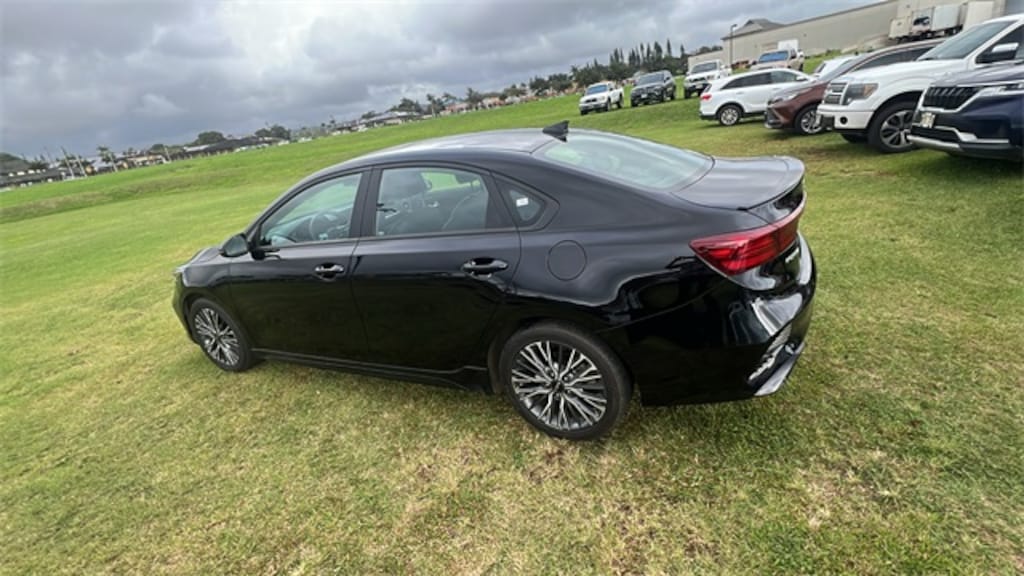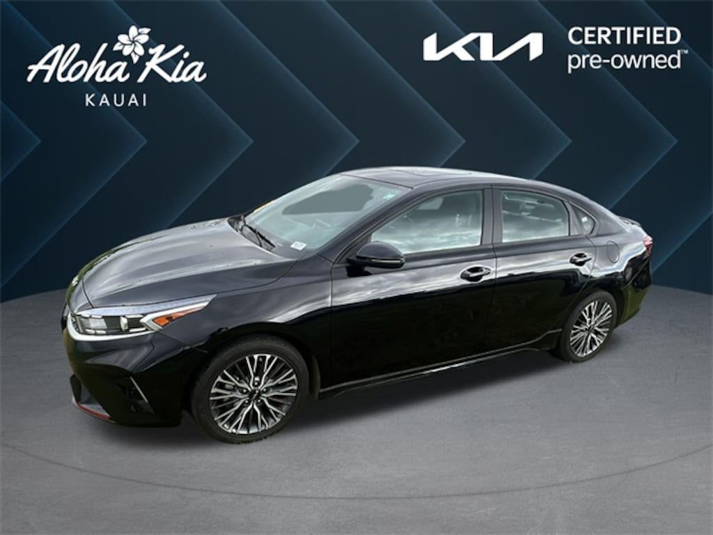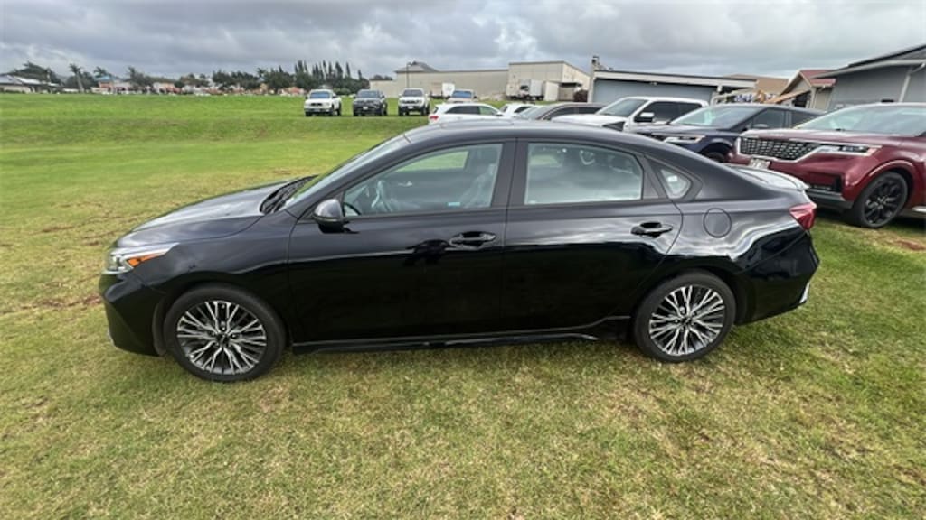Certified. Aurora Black Pearl 2023 Kia Forte GT-Line FWD CVT 17" x 7.0J Alloy Wheels, 4-Wheel Disc Brakes, 6 Speakers, ABS brakes, Air Conditioning, Alloy wheels, AM/FM radio: SiriusXM, Apple CarPlay & Android Auto, Auto High-beam Headlights, Automatic temperature control, Brake assist, Bumpers: body-color, Cloth & SynTex Seat Trim, Delay-off headlights, Driver door bin, Driver vanity mirror, Dual front impact airbags, Dual front side impact airbags, Electronic Parking Brake (EPB), Electronic Stability Control, Emergency communication system, Exterior Parking Camera Rear, Forward Collision Avoidance-Assist - Cyclist, Front anti-roll bar, Front Bucket Seats, Front Center Armrest, Front dual zone A/C, Front fog lights, Front reading lights, Front wheel independent suspension, Fully automatic headlights, GT-Line Premium Package, Heated door mirrors, Illuminated entry, Leather Shift Knob, Leather steering wheel, LED Interior Lighting, Low tire pressure warning, Navigation System, Navigation-Based Smart Cruise Control (NSCC), Occupant sensing airbag, Outside temperature display, Overhead airbag, Overhead console, Panic alarm, Passenger door bin, Passenger vanity mirror, Power door mirrors, Power steering, Power Sunroof, Power windows, Radio data system, Radio: 10.25" Display Audio, Radio: harman kardon Premium Audio, Rear seat center armrest, Rear window defroster, Remote keyless entry, Security system, Smart Cruise Control w/Stop & Go, Speed control, Split folding rear seat, Spoiler, Sport steering wheel, Steering wheel mounted audio controls, Tachometer, Telescoping steering wheel, Tilt steering wheel, Traction control, Trip computer, Turn signal indicator mirrors, Variably intermittent wipers, Wireless Charging. 2.0L I4 MPI